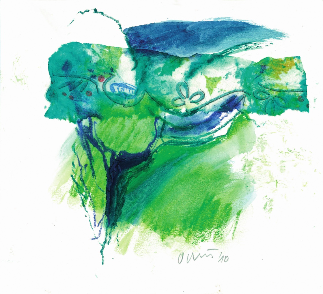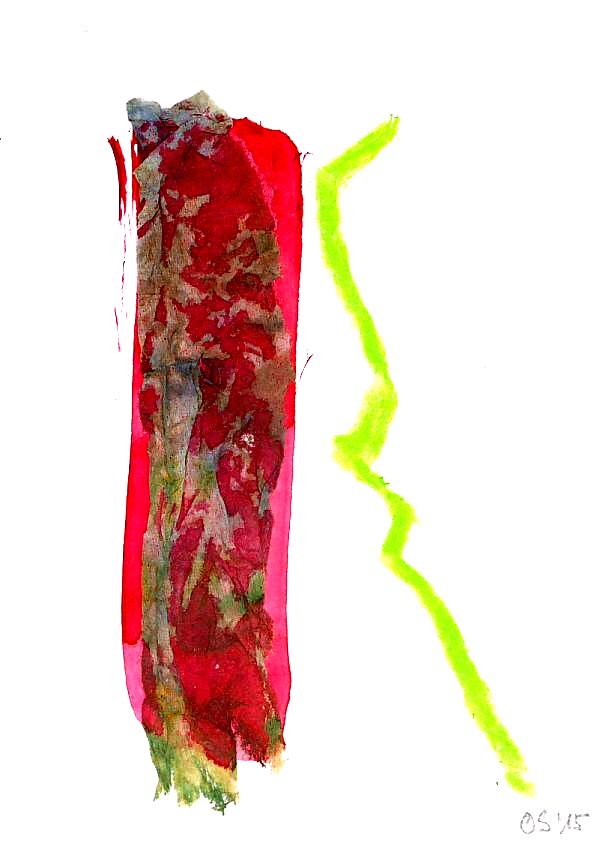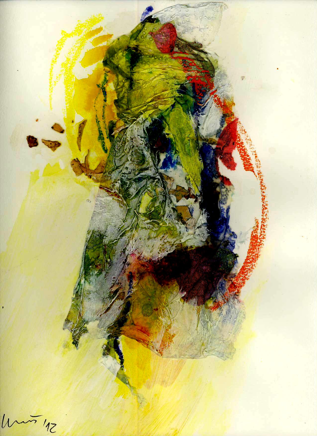 Das Herausarbeiten von Collagen erfordert etwas mehr an handwerklichen Griffen und Abläufen und ist deshalb nur in einer Werkstatt möglich. Hier schafft Schütz sich auch durch „fremde“ Materialien die reale, von ihm hereingenommene Ebene. Er klebt sie auf seinen Papiergrund, faltet, schiebt, bemalt sie, und antwortet auf ihre – der Farbe und dem Papier zunächst fremde Struktur, bis er sie in seine Komposition eingebunden hat. Bevorzugt nimmt er weiche Haushaltspapiere oder bedruckte Küchenrollen, um eine zweite Bildebene zu schaffen, die dann zerfurcht, gerissen, löchrig, zerfasert, immer jedoch fragmentarisch gegen das plan gespannte Aquarellpapier argumentieren.