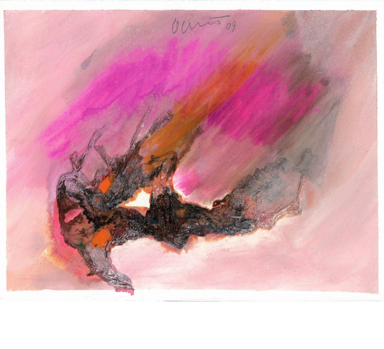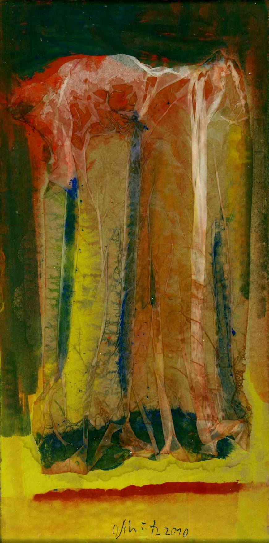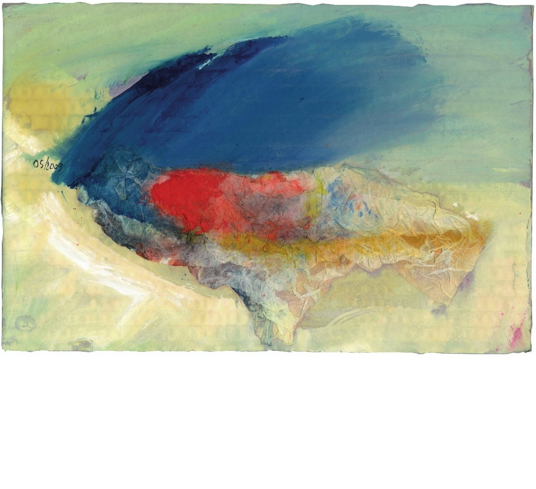 Das Herausarbeiten von Collagen erfordert etwas mehr an handwerklichen Griffen und Abläufen und ist deshalb nur in einer Werkstatt möglich. Hier schafft Schütz sich auch durch „fremde“ Materialien die reale, von ihm hereingenommene Ebene. Er klebt sie auf seinen Papiergrund, faltet, schiebt, bemalt sie, und antwortet auf ihre – der Farbe und dem Papier zunächst fremde Struktur, bis er sie in seine Komposition eingebunden hat. Bevorzugt nimmt er weiche Haushaltspapiere oder bedruckte Küchenrollen, um eine zweite Bildebene zu schaffen, die dann zerfurcht, gerissen, löchrig, zerfasert, immer jedoch fragmentarisch gegen das plan gespannte Aquarellpapier argumentieren.